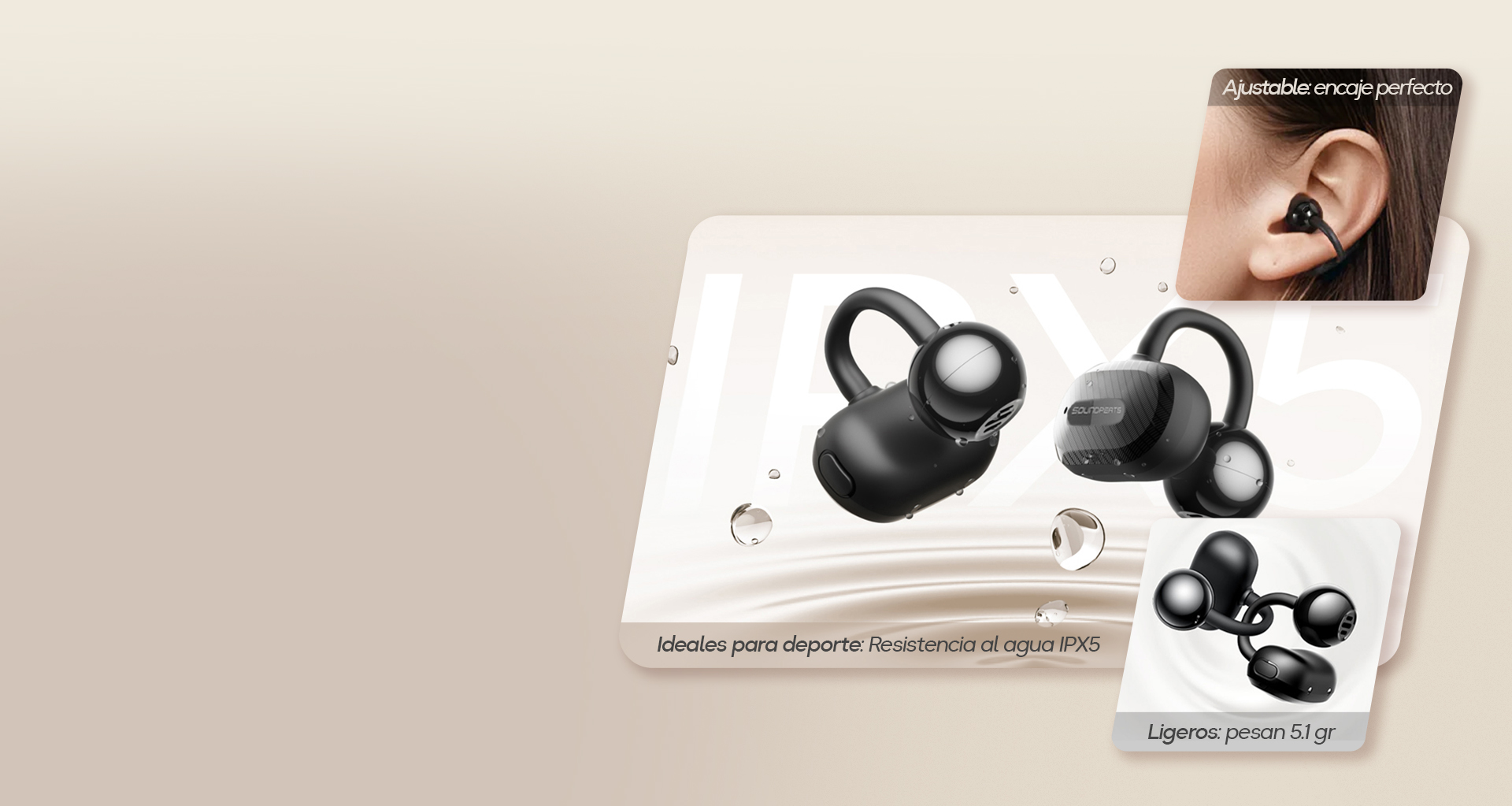 La resistencia al agua IPX5 los hace ideales para entrenamientos, caminatas o uso diario, protegiéndolos del sudor y las salpicaduras. Con un peso de apenas 5,1 gr por auricular y ganchos suaves y flexibles, los Air Clip ofrecen un ajuste ergonómico y estable.