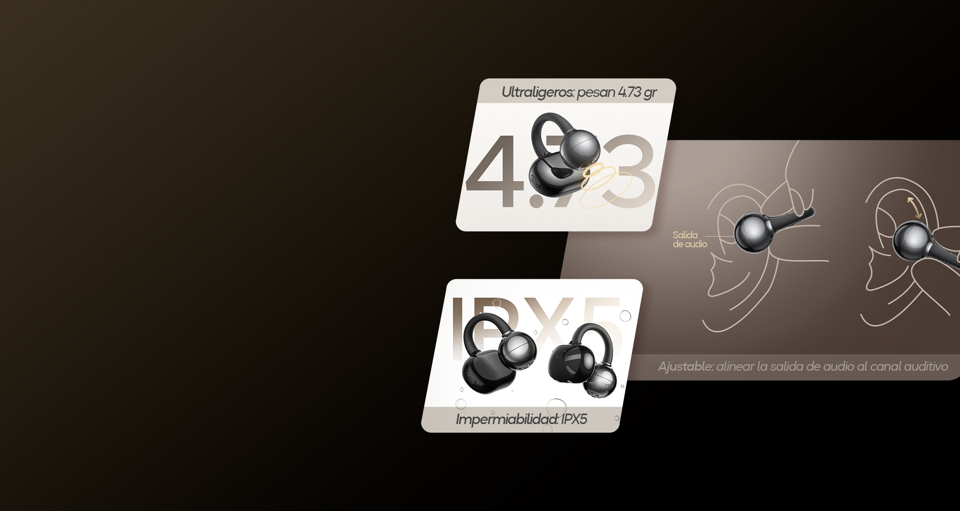 Presentan un diseño Open-Ear tipo Clip-On, que se apoya suavemente sobre la oreja sin insertarse en el canal auditivo. Este formato ofrece una experiencia de uso cómoda y segura, permitiendo escuchar música o atender llamadas sin perder la percepción del entorno. Son ideales para actividades diarias, entrenamiento ligero o uso prolongado.